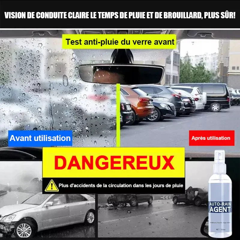 Agent anti-buée et anti-pluie en verre à formule super-hydrophobe. Vision de conduite claire par temps de pluie et de brouillard, plus sure!