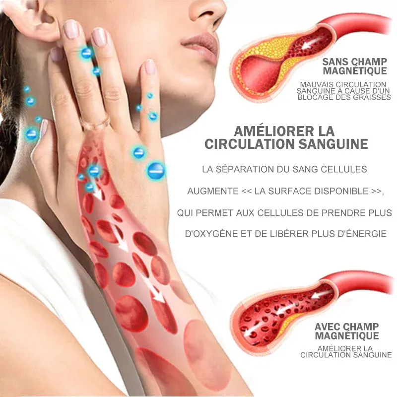 Les produits magnétiques ordinaires utilisent soit des aimants avec très peu de pénétration de champ, soit des pôles similaires se repoussent, créant une zone morte entre les aimants. Cet anneau rotatif à ions de titane utilise des directions polaires sud et nord alternées pour maximiser le flux de champ magnétique et libère des charges électromagnétiques pour éliminer les blocages autour du corps et restaurer le flux d’énergie naturel.