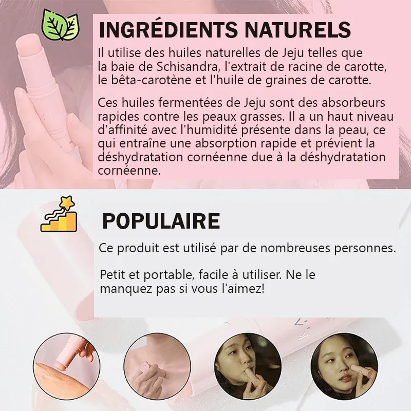 Nous utilisons des huiles naturelles de Jeju telles que les baies de Schisandra, l’extrait de racine de carotte, le bêta-carotène et l’huile de graines de carotte.