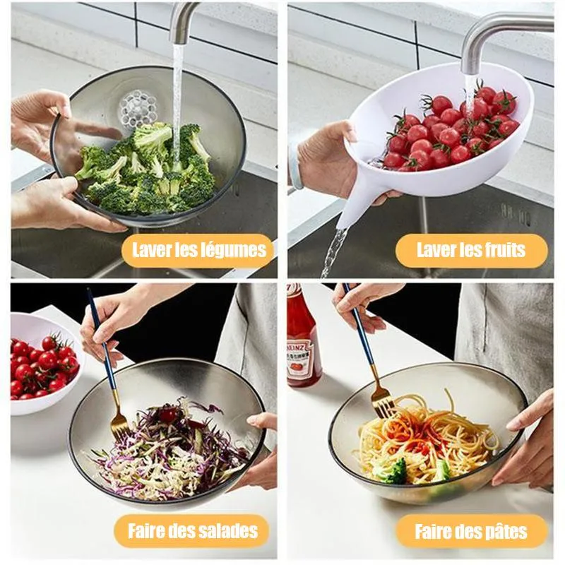 Un bol avec un filtre et un trou a de multiples fonctions, c’est donc un auxiliaire de cuisine indispensable.