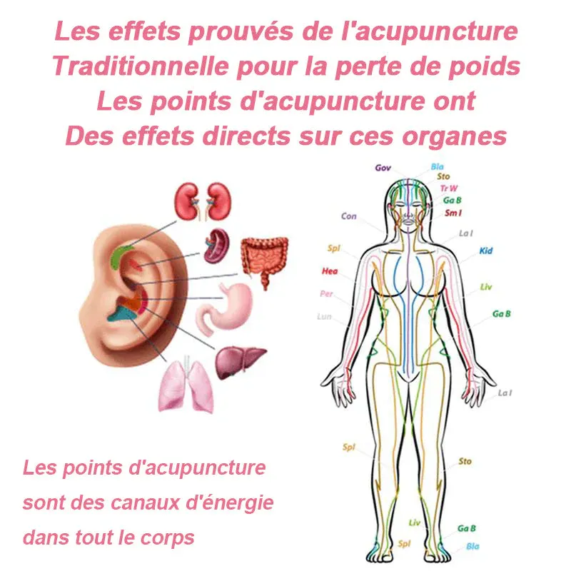 - On pense que les points d’acupuncture stimulent les organes et les systèmes du corps en affectant le flux de qi, ou énergie vitale, dans tout le corps. Le Qi circule dans les méridiens, qui sont des canaux d’énergie dans tout le corps qui se connectent aux organes et aux systèmes du corps. Cette stimulation active les processus de guérison naturels du corps et aide à rétablir l’équilibre des systèmes du corps. Grâce à la stimulation de points d’acupuncture spécifiques, il améliore la digestion, entraînant une amélioration de la fonction métabolique et une perte de poids.