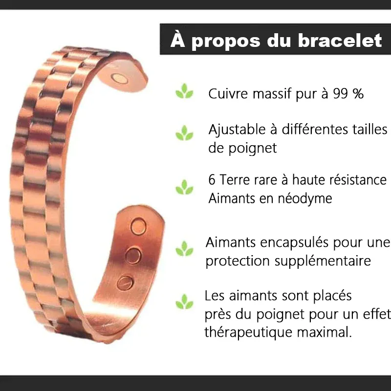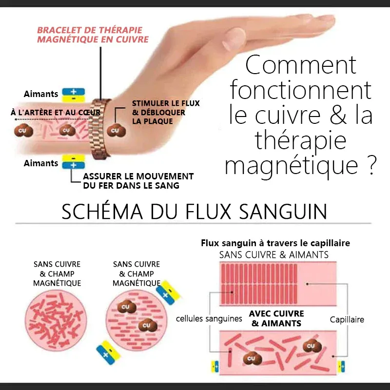 • L’idée de base des bracelets en cuivre est que notre corps manque de cuivre et que le cuivre s’infiltrera du bracelet dans la peau pour soulager l’inflammation des articulations et stimuler la circulation sanguine.