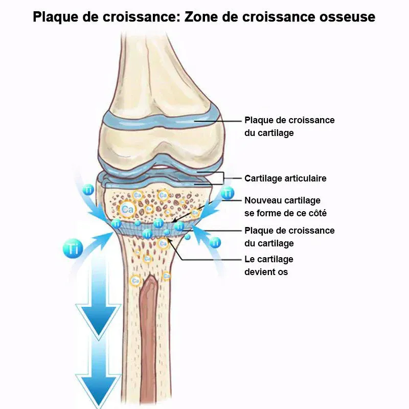 - La principale voie par laquelle les éléments de titane sont transportés passe par les trois principaux points d’acupuncture de croissance. Ils pénètrent dans la circulation sanguine et circulent dans tout le corps, s’accumulant dans les plaques de croissance et les zones riches en calcium des genoux, des coudes et de la colonne vertébrale. Cette interaction rend l’os trabéculaire plus poreux, forçant la production de nouvelles cellules osseuses pour combler les lacunes. En conséquence, il stimule la croissance et l’allongement des jambes, des bras et de la colonne vertébrale, ce qui entraîne une croissance globale du corps et des proportions corporelles parfaites !