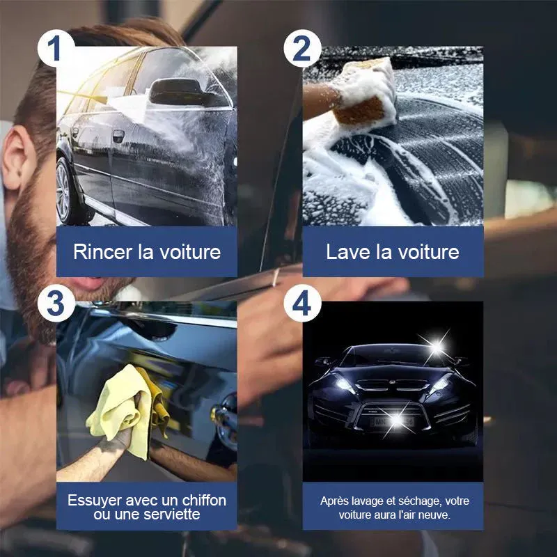 Lavage, cirage et polissage de voiture en une seule étape. Cire de carnauba spécialement ajoutée qui peut décontaminer la voiture et former un film de cire pour protéger et améliorer la brillance de la peinture de la voiture afin que votre voiture reste brillante comme neuve.