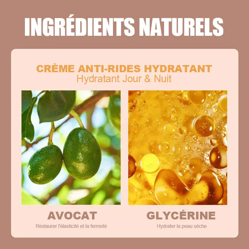 Cette crème anti-rides est fabriquée avec des ingrédients naturels et sûrs. Avocat: Restaurer l’élasticité et la fermeté de la peau. Glycérine: Hydrater les peaux sèches.
