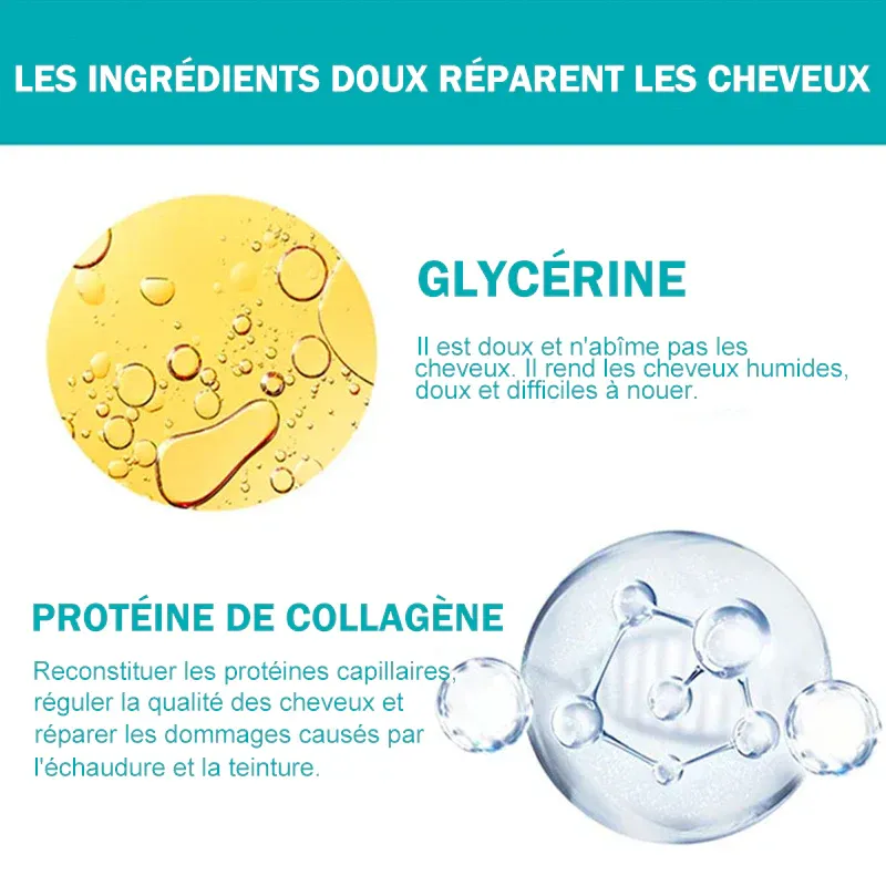 - INGRÉDIENTS DOUX RÉPARANT LES CHEVEUX : GLYCÉRINE, douce et non agressive pour les cheveux, rend les cheveux humides, doux et faciles à nouer. PROTEINE DE COLLAGÈNE,Reconstitue les protéines du cheveu, régule la qualité du cheveu et répare les dommages causés par les échaudages et les teintures.