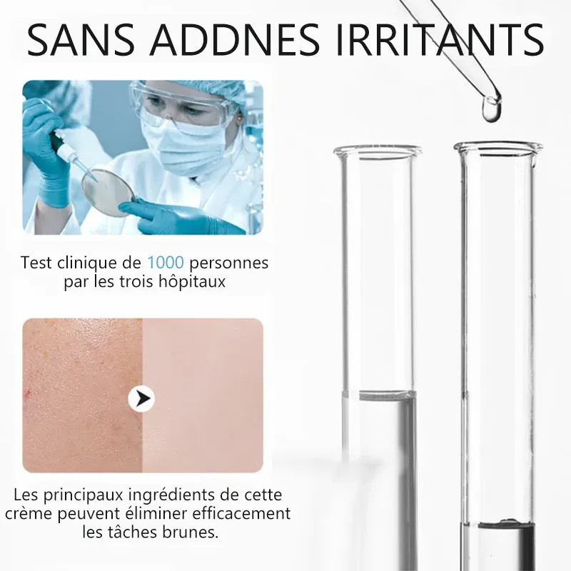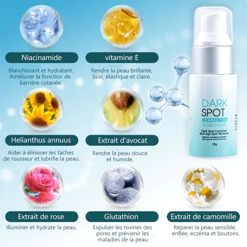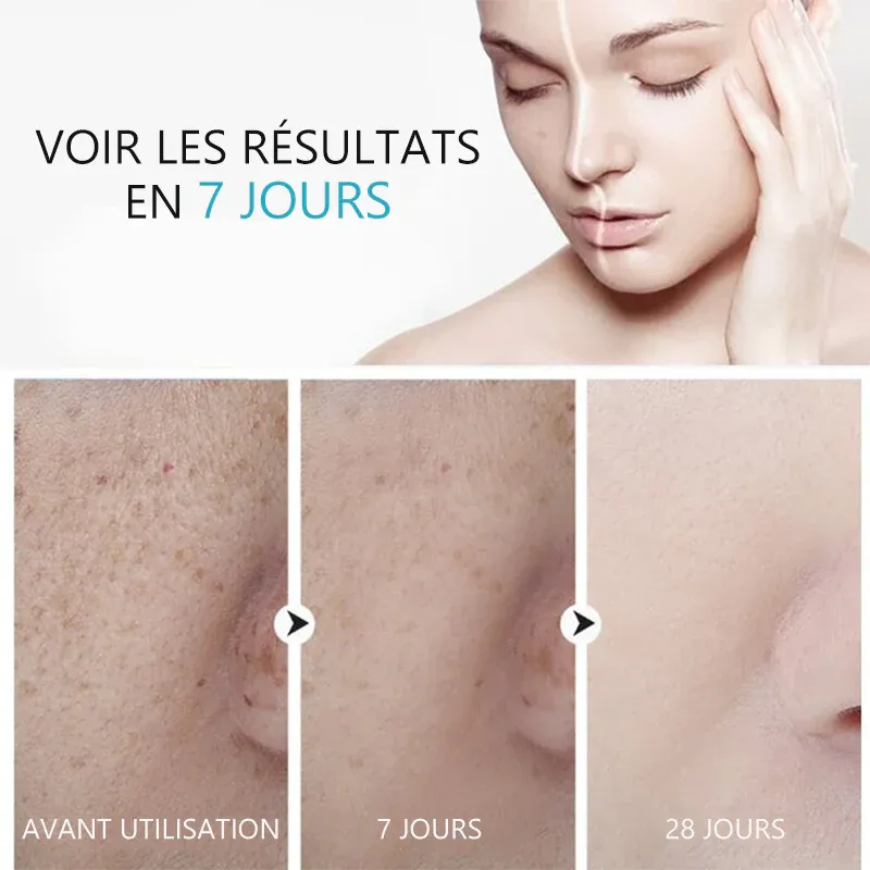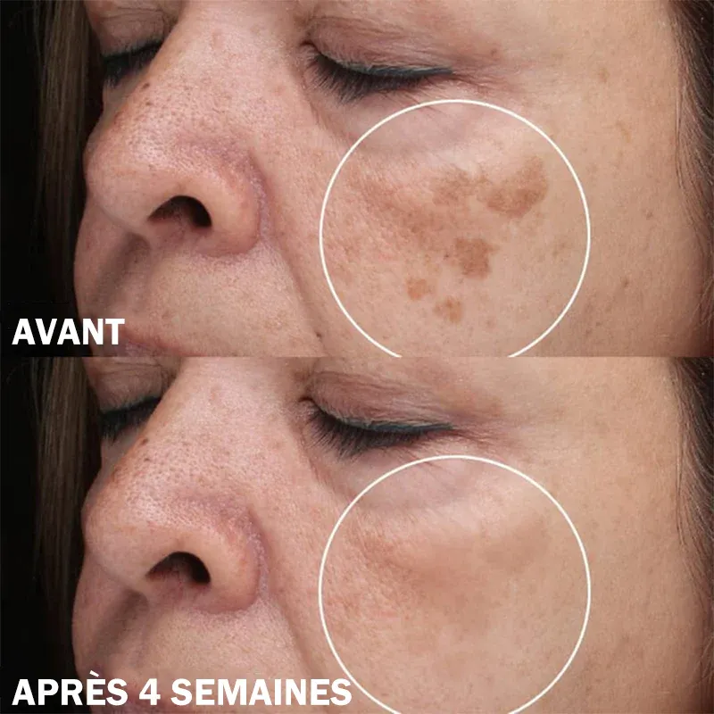 - Blanchit et élimine les taches de rousseur, le mélasma et autres taches brunes