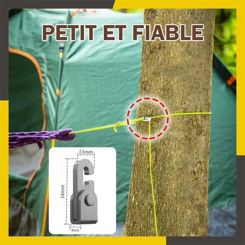 Les crochets sans nœud combinent les fonctions de tension, de traction, de suspension, de connexion, d’emballage et de sécurisation de charges légères. Il aide à verrouiller la corde et à l’empêcher efficacement de glisser, facile à régler la longueur de la corde. Cela aide à protéger votre tente des vents forts et des fortes pluies.