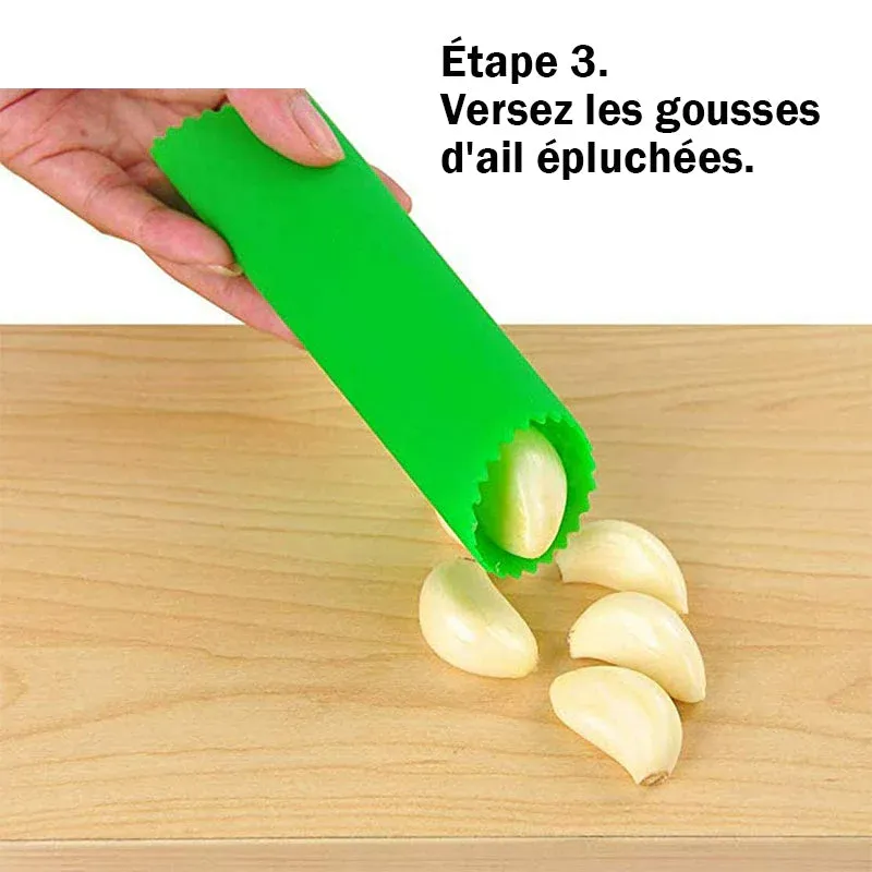 Il suffit de placer quelques gousses d’ail dans le tube et de le faire rouler d’avant en arrière pour éplucher la peau de l’ail en quelques secondes. -
