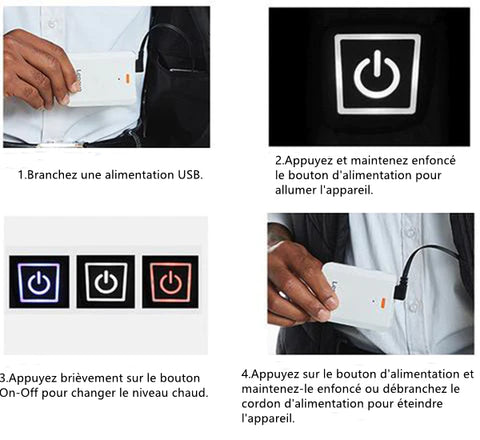 Ce gilet chauffant est compatible avec toute source d’alimentation mobile avec sortie USB 5V 2A/2.2A.