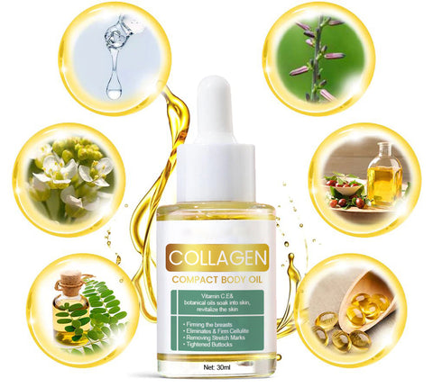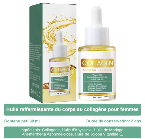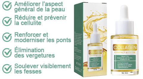 - Cette huile raffermissante du corps au collagène est un produit qui aide à réduire les signes visibles du vieillissement et les rides et donne à la peau un aspect revitalisé en seulement 3 à 5 semaines. Cette huile contient des composants scientifiquement testés qui peuvent lutter efficacement contre les rides, tels que le collagène, l’acide hyaluronique, les esters phénoliques et la vitamine E.