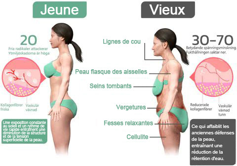 - Avec l’âge, le corps subit naturellement les effets du vieillissement. Ce processus commence généralement vers l’âge de 20 ans, lorsque la production de collagène (qui donne sa structure à la peau) ralentit et que l’élastine (qui aide la peau à rebondir) perd de son élasticité ou se dégrade. Ce phénomène est particulièrement visible chez les femmes. En outre, l’élimination des cellules mortes peut prendre plus de temps et la production de nouvelles cellules cutanées peut être légèrement réduite, ce qui entraîne un relâchement et des rides dans la plupart des tissus cutanés du corps.