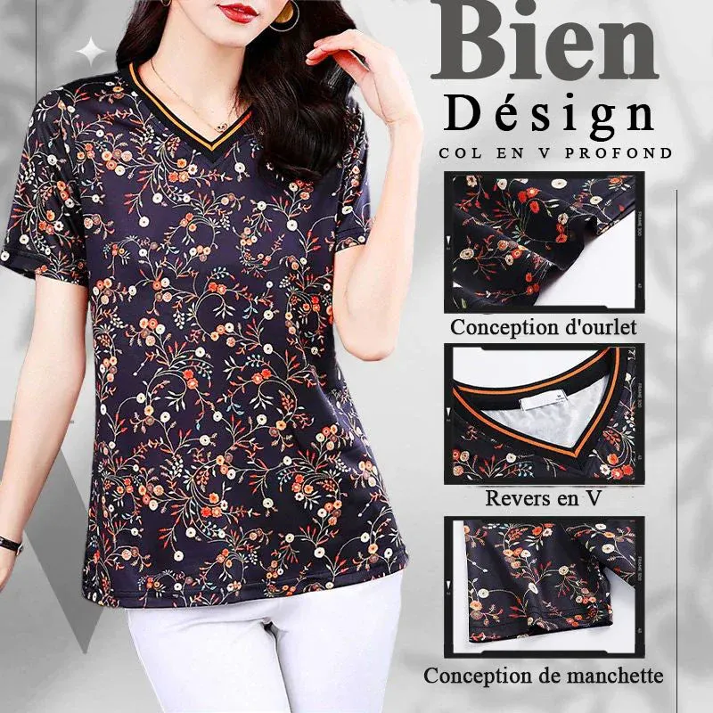 Modèle à encolure en V avec surpiqûres contrastées sur l’encolure. Le col en V peut révéler la clavicule, ce qui rend votre visage plus petit visuellement.