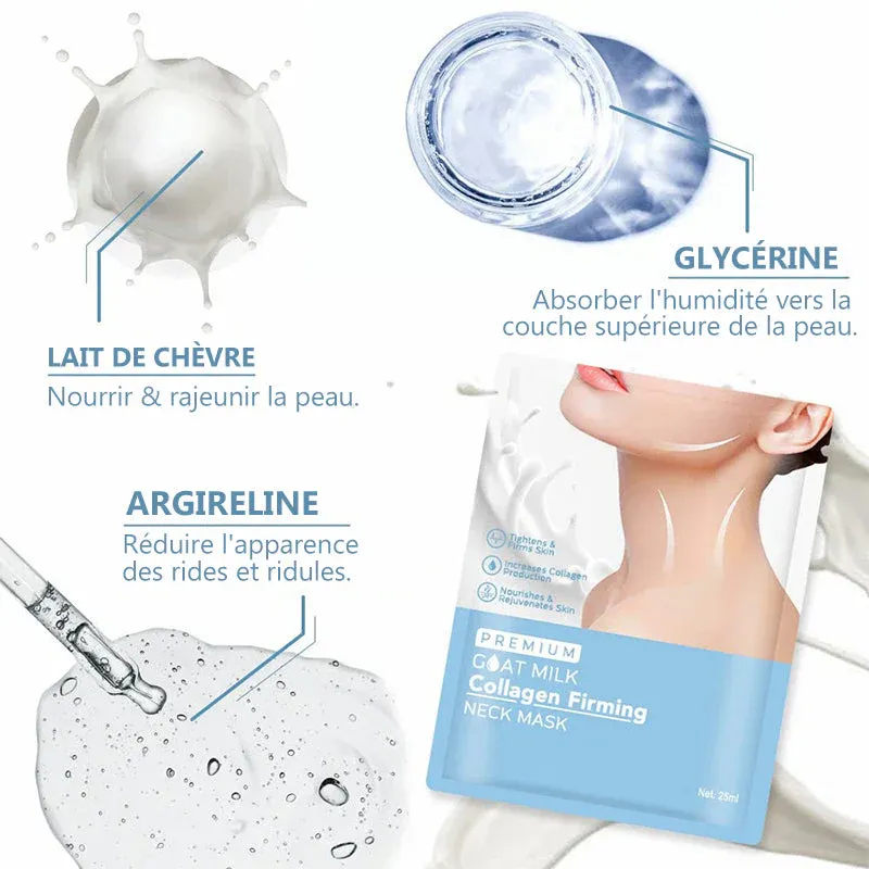- Le masque raffermissant pour le cou au collagène de lait de chèvre avancé est spécialement formulé pour aider à améliorer l’apparence du cou. Mettre le masque sur votre cou peut aider à combattre l’affaissement et à lisser les rides et ridules dans la région. Le masque contient des ingrédients qui détendent les muscles dynamiques, les rendant moins visibles pour un cou d’apparence plus jeune. Ajoutez ce masque à votre routine de soins de la peau habituelle pour des résultats à vie, vous donnant le cou lisse, souple et jeune dont vous avez toujours rêvé.