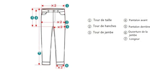 | Pantalon avant | 30 | 30,5 | 31 | 31,5 | 32 | 32,5 | 33 | 33,5 | 34 | 34,5 |