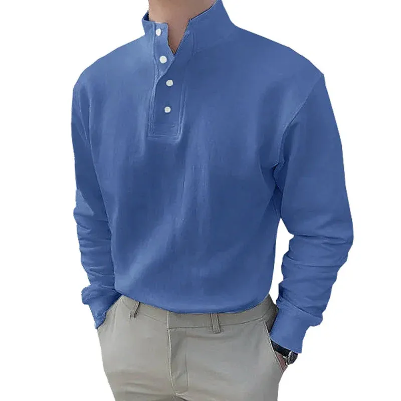 Chemise classique à col montant. Style simple, couleur unie, coupe ajustée, manches longues (enroulement). Fermeture à boutons, ourlet arrondi, détail de bouton en vedette.