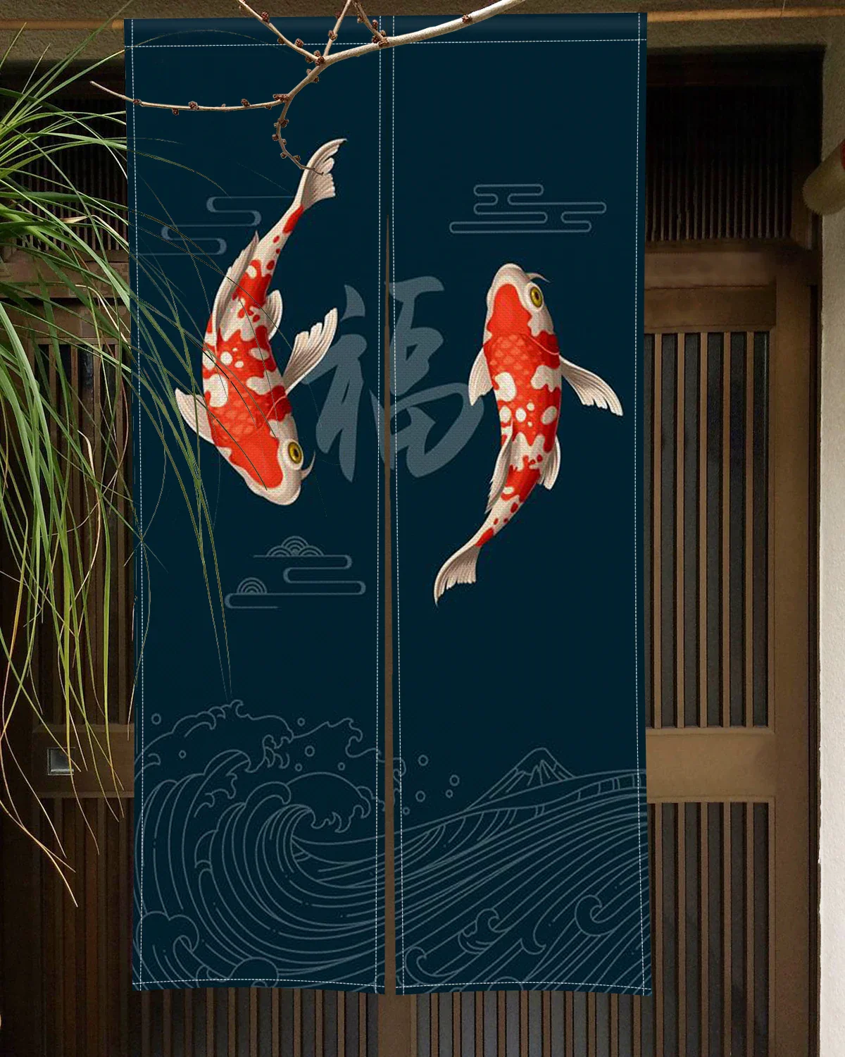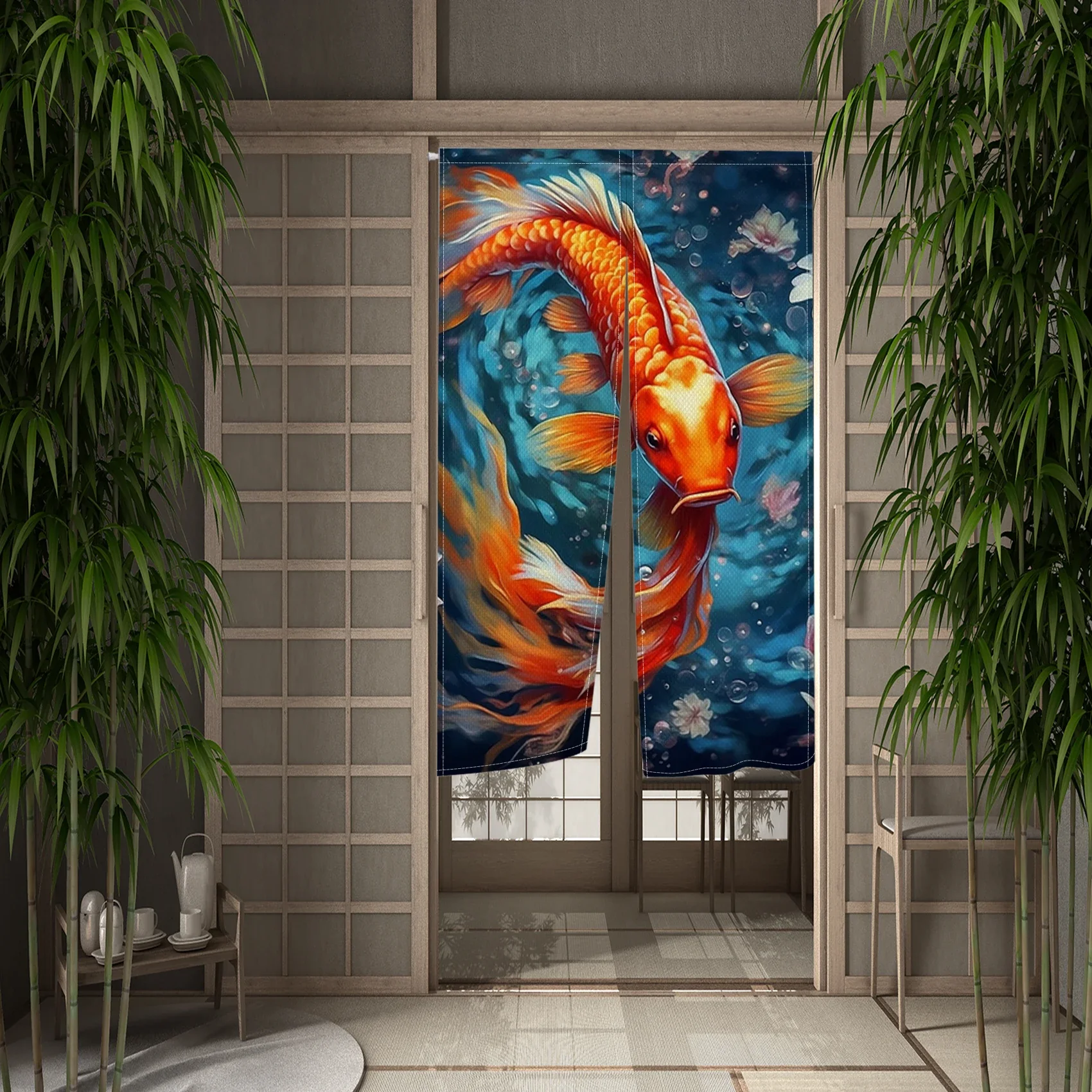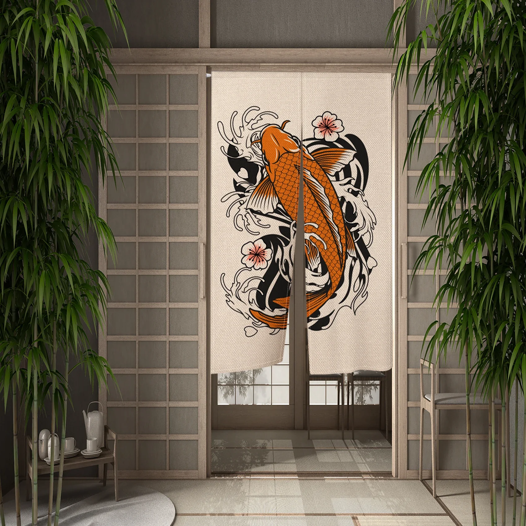 Confectionné en tissu léger et souple, ce rideau se suspend facilement et apporte un décor subtil et harmonieux. Le motif de koi, symbolisant la force et la chance, s’intègre parfaitement dans un environnement zen ou inspiré de la culture japonaise.