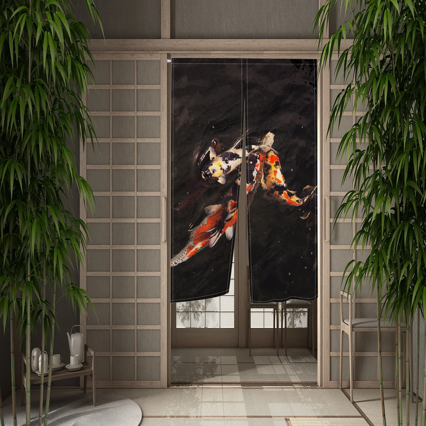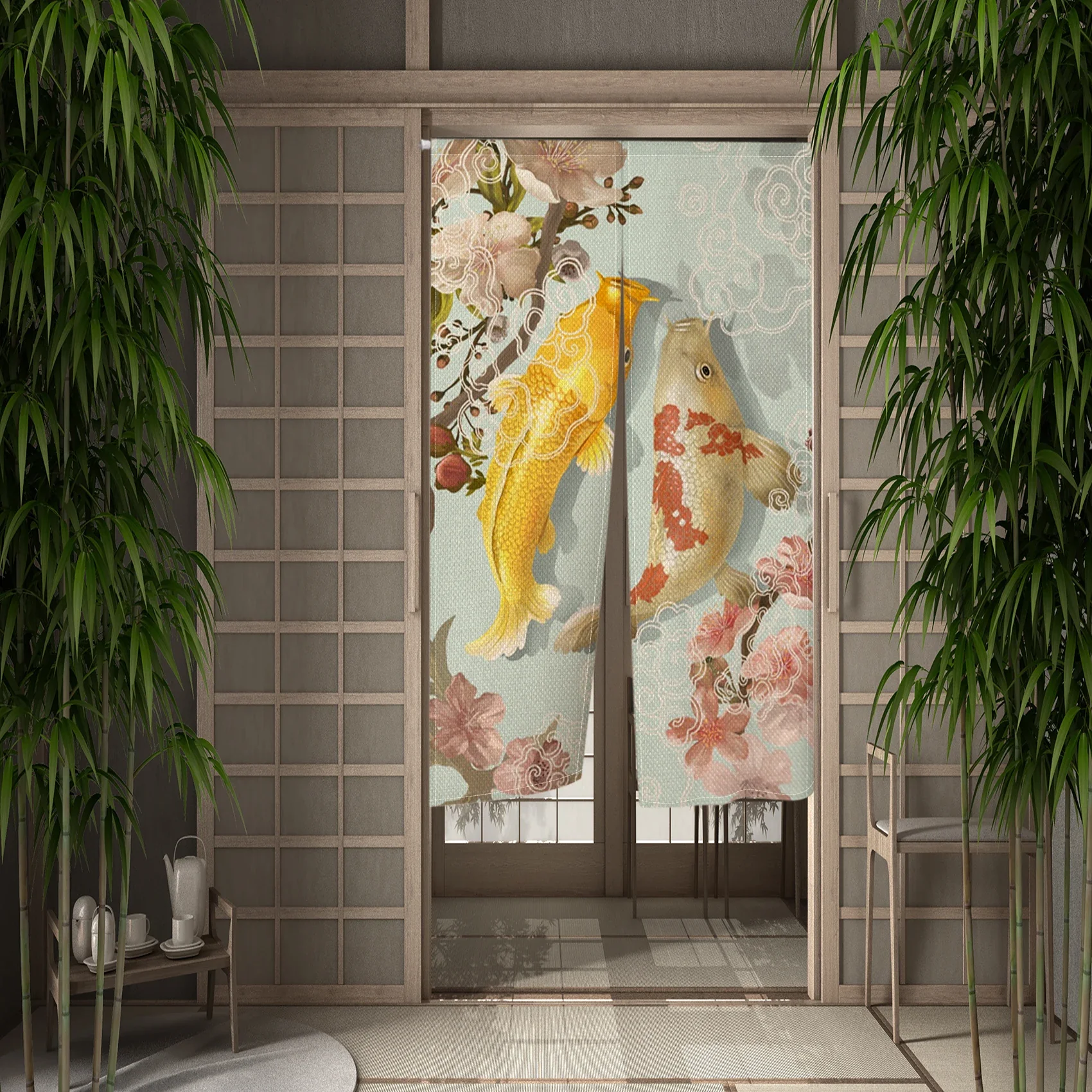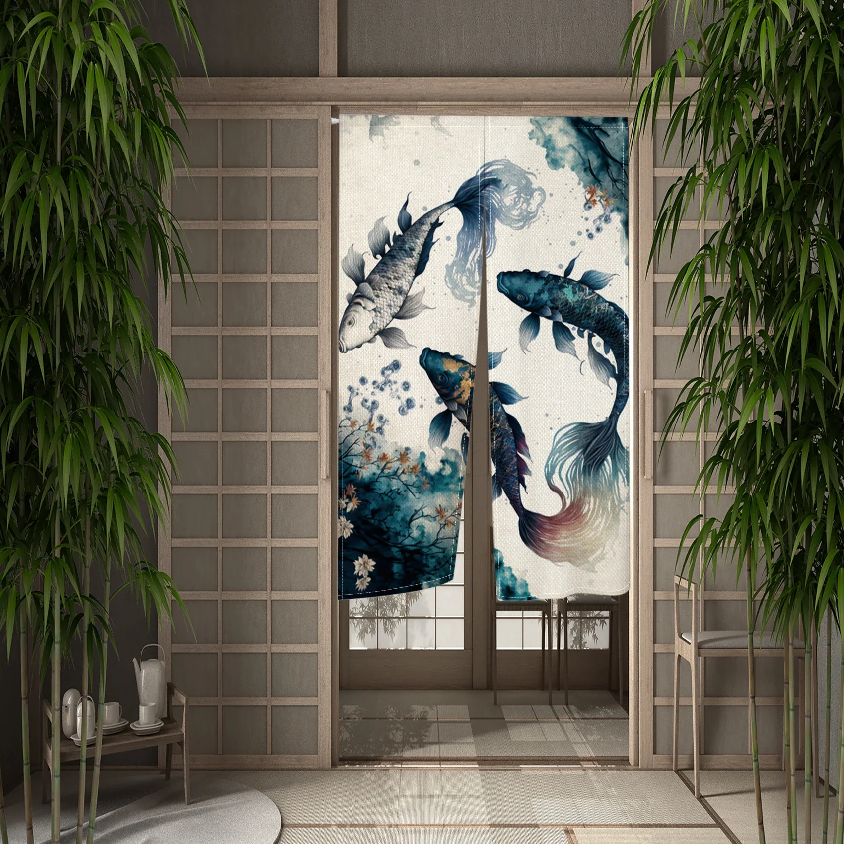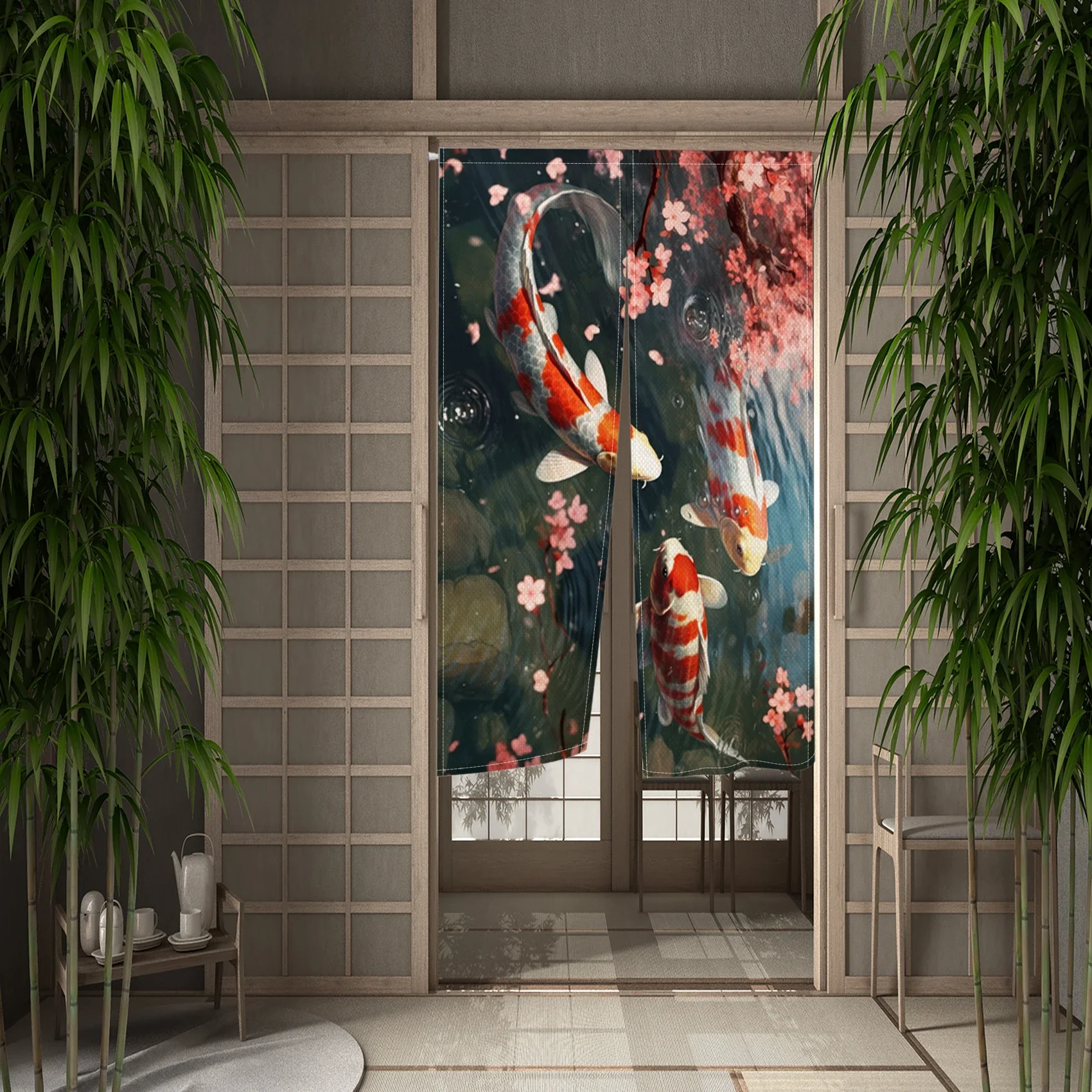 Confectionné en tissu léger et souple, ce rideau se suspend facilement et apporte un décor subtil et harmonieux. Le motif de koi, symbolisant la force et la chance, s’intègre parfaitement dans un environnement zen ou inspiré de la culture japonaise.