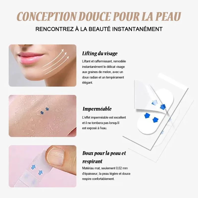 Ces bandes et autocollants de lifting peuvent être appliqués sur l’ensemble de votre visage, de votre cou et d’autres parties du corps. Parfait pour toutes les occasions telles que les mariages, le travail, les fêtes, les séances photo, les anniversaires ou d’autres occasions importantes.