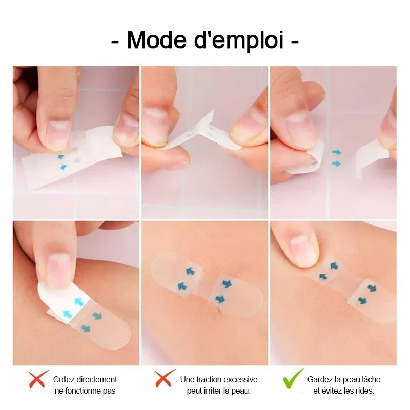 Nettoyez et séchez votre visage, appliquez une extrémité du ruban adhésif sur un endroit de la peau, puis tirez la peau vers l’arrière de 3 à 4 pouces et appuyez fermement, et vous pouvez voir des résultats étonnants.