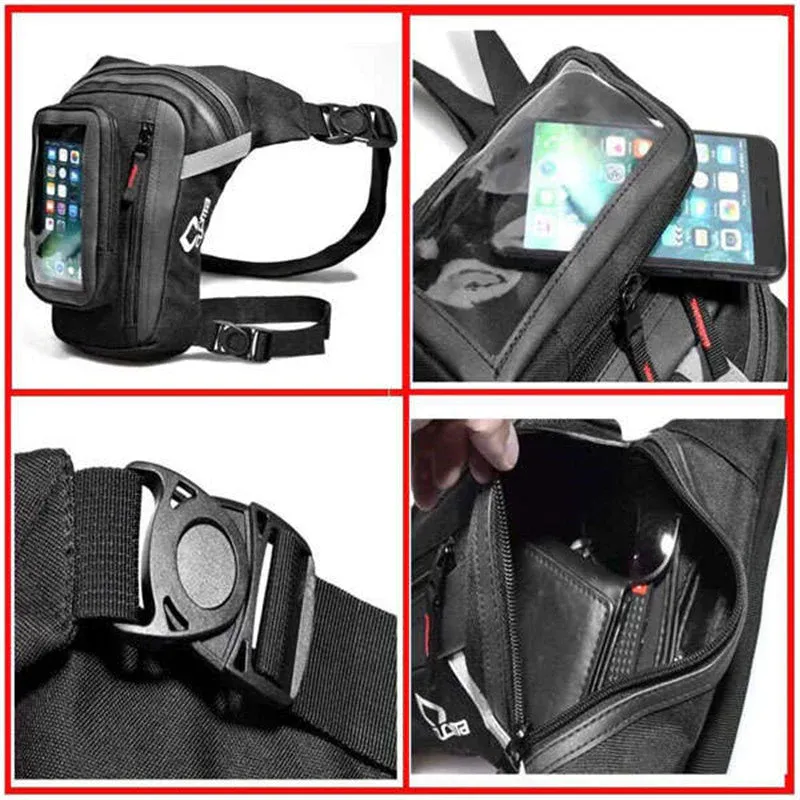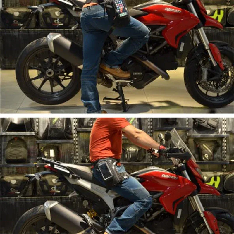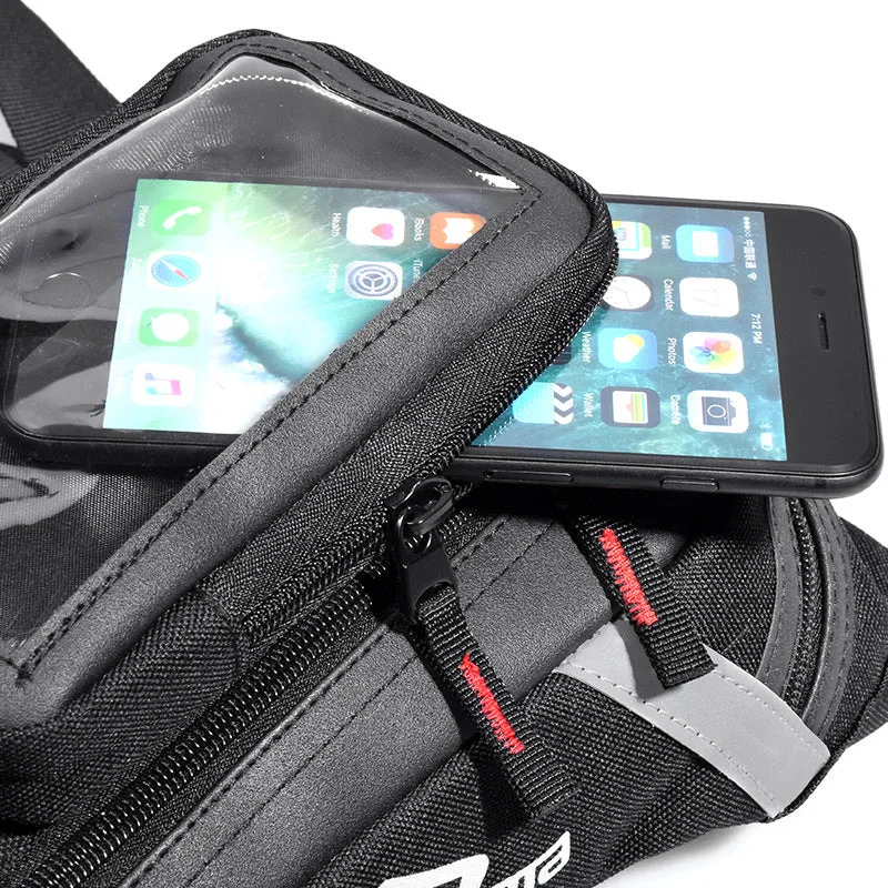 1 grand compartiment principal 2 mini-compartiment latéral 3 ceinture 4 sangle de cuisse 5 accessoire pour téléphone portable 6 fente de fixation pour accessoire pour téléphone portable