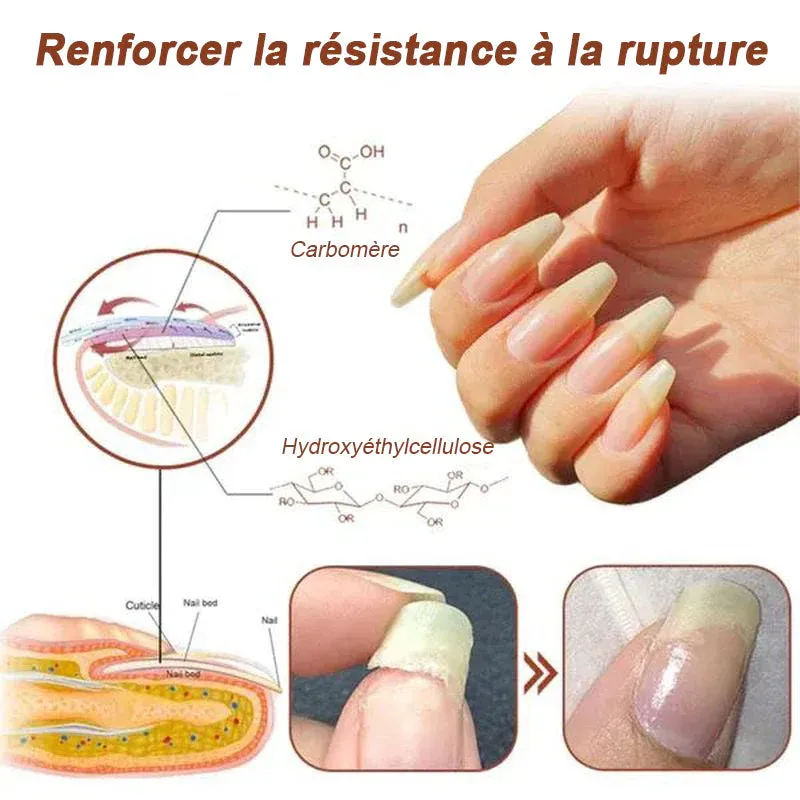 - Ce sérum de croissance des ongles est formulé pour aider à reconstituer vos ongles naturels. Cette huile peut aider à hydrater, faire pousser, renforcer et éclaircir vos ongles. Il est riche en ingrédients respectueux des ongles et en vitamines qui favorisent la santé globale des ongles. Ingrédients clés L’hydroxyéthylcellulose et le carbomère aident à augmenter la résistance à la rupture pour des ongles plus épais et plus forts. Cela protège les ongles des dommages et des cassures, leur permettant de pousser plus longtemps et plus fort sans devenir cassants ou faibles.
