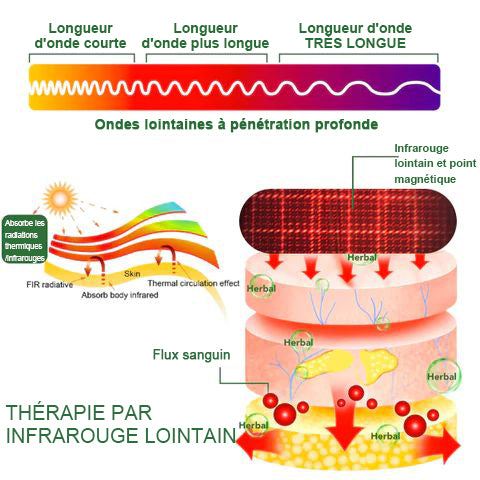 - Thérapie infrarouge lointain Le rayonnement infrarouge lointain fait partie du spectre électromagnétique infrarouge. Le rayonnement infrarouge lointain peut pénétrer les tissus sous-cutanés humains jusqu’à 16 mm, ce qui signifie qu’il peut pénétrer les tissus musculaires profonds, les tendons, les nerfs, les vaisseaux sanguins et les ligaments. Il aide à réparer les cellules endommagées, à dilater les microvaisseaux, à favoriser la circulation sanguine, à activer les enzymes, à améliorer la circulation sanguine et à accélérer le métabolisme du sang et des tissus cellulaires. Pour ce faire, il encourage la fréquence cardiaque et l’activité, même lorsque vous ne faites pas d’exercice.