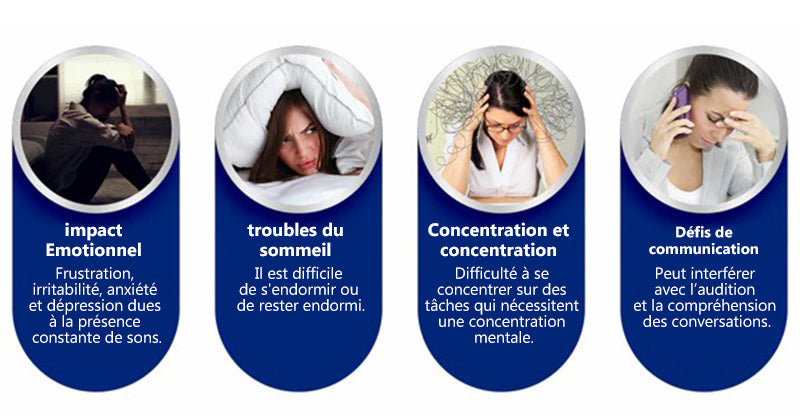 • Effets du mouvement: Les acouphènes peuvent entraîner de la frustration, de l’irritabilité, de l’anxiété et de la dépression en raison de la présence constante du son et de la difficulté de trouver un soulagement.
