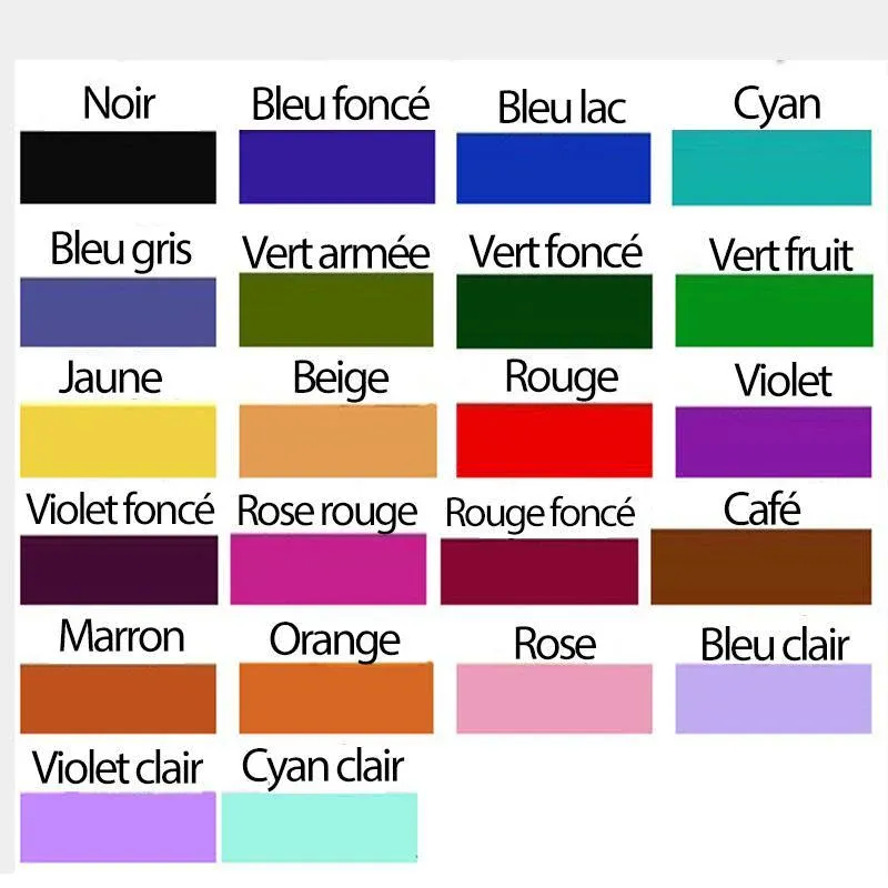 - Couleur: Noir, Bleu foncé, Bleu lac, Cyan, Bleu gris, Vert armée, Vert foncé, Vert fruit, Jaune, Beige, Rouge, Violet,Violet foncé, Rose rouge, Rouge foncé, Café, Marron, Orange, Rose, Bleu clair, Violet clair, Cyan clair.