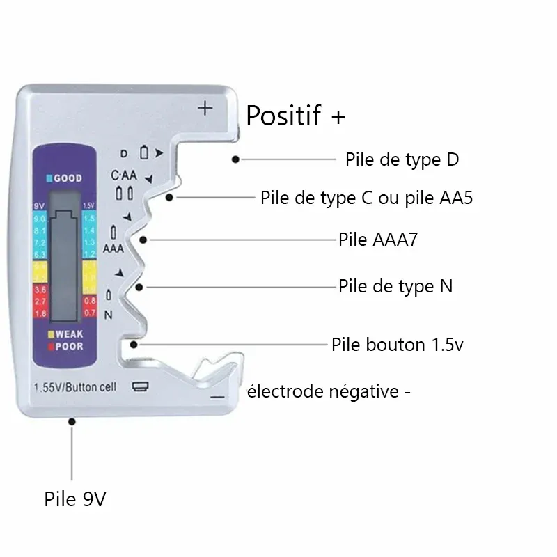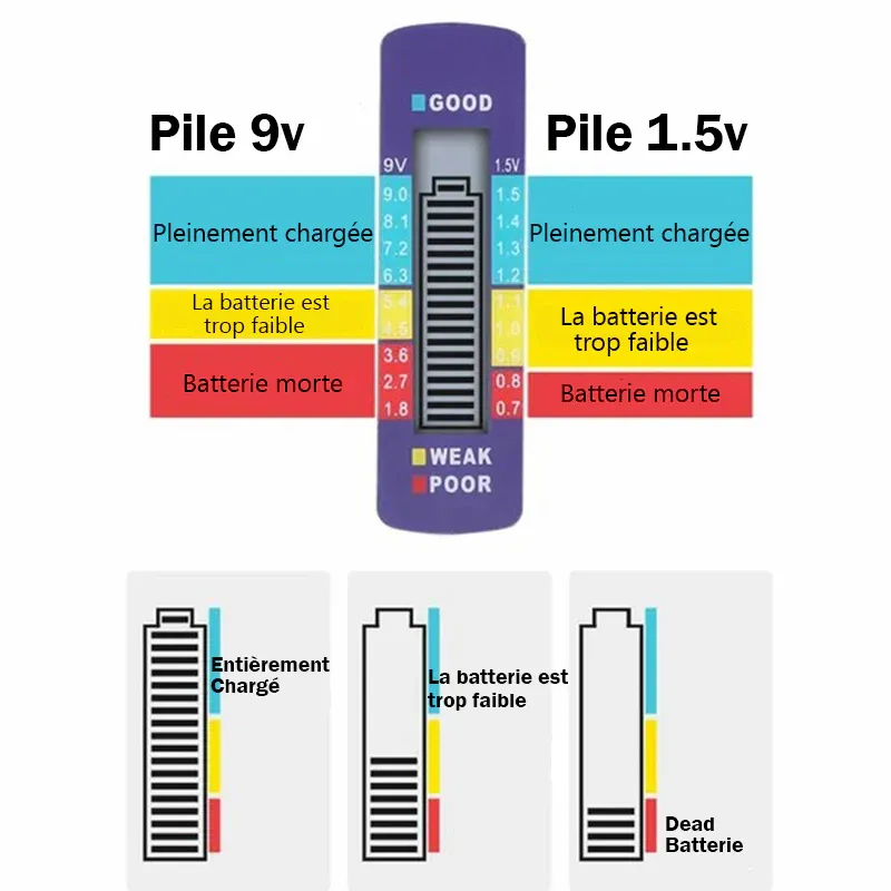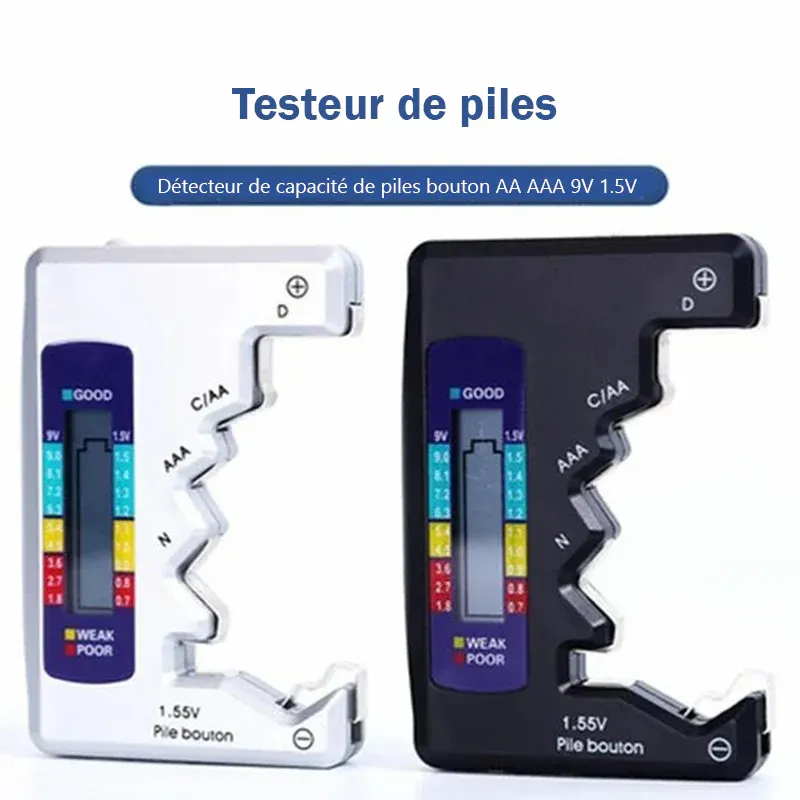 - â Teste les piles bouton C, AA, AAA, D, N, 9V 6F22 et 1,5V